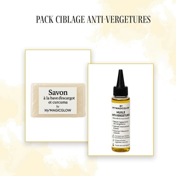 Le Pack Ciblage Anti-Vergetures a été conçu pour celles et ceux qui souhaitent prévenir et atténuer les vergeturestout en prenant soin de la peau en profondeur. La combinaison du savon curcuma & bave d’escargot et de l’huile anti-vergetures apporte nettoyage, régénération et réparation, pour une peau plus douce, lisse et nourrie.