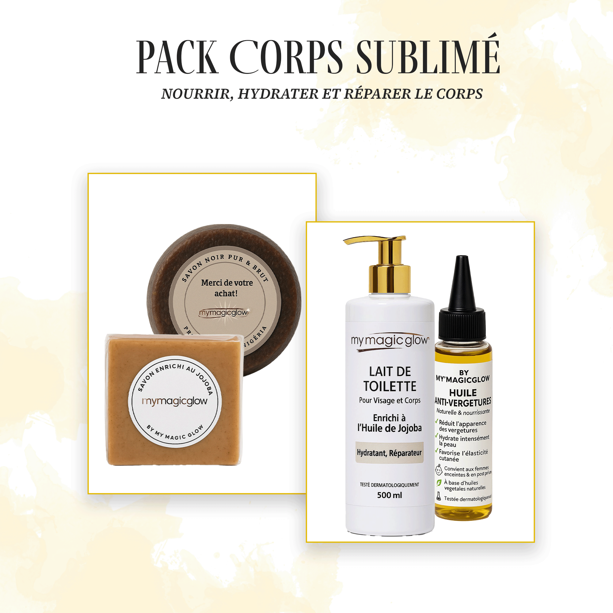 Le Pack Corps Sublimé My’MagicGlow est conçu pour offrir une soin complet du corps, en combinant hydratation, régénération et protection des peaux sèches ou sensibles. Cette routine luxueuse apporte douceur, éclat et souplesse, tout en prenant soin des zones fragilisées.